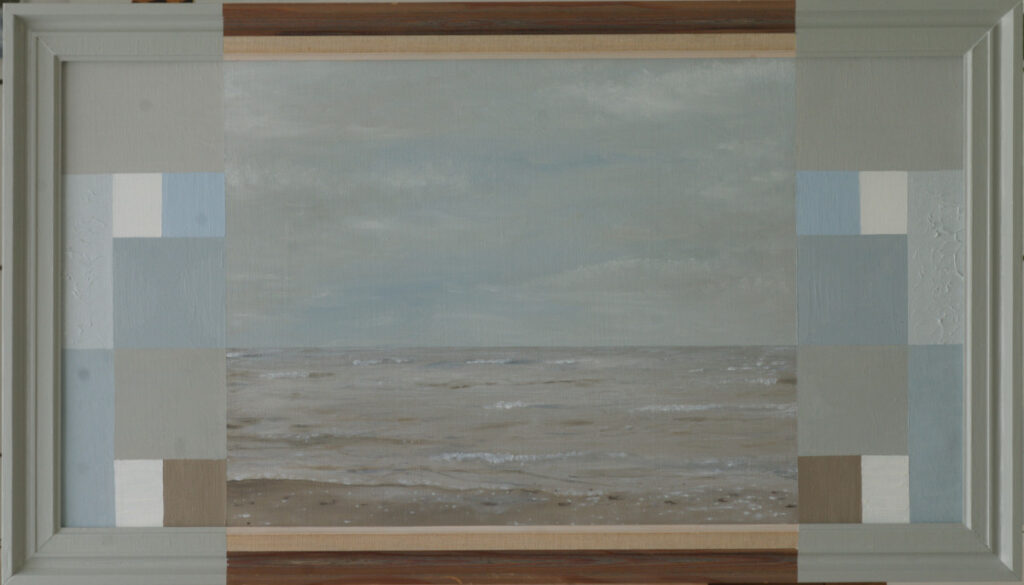 The geometric patterns contain colours extracted from the central seascape, but the partially painted border creates deliberate separation. This division questions the relationship between observed reality and analytical abstraction—the architectural framework interrupts rather than frames, suggesting fragmentation of memory. Part of the roB project exploring distance and displacement.